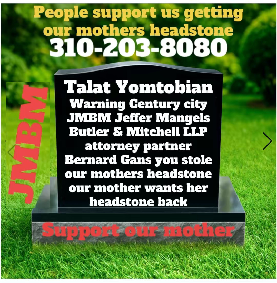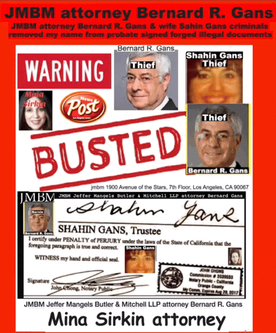 Suing JMBM partner $500,000,000,000.00 Busted criminal attorneys Jeffer Mangels Butler & Mitchell LLP lawyer Bernard Reginald Gans #57068 Bernard Gans Mina Sirkin law group JMBM killed my mom to get her fortune.