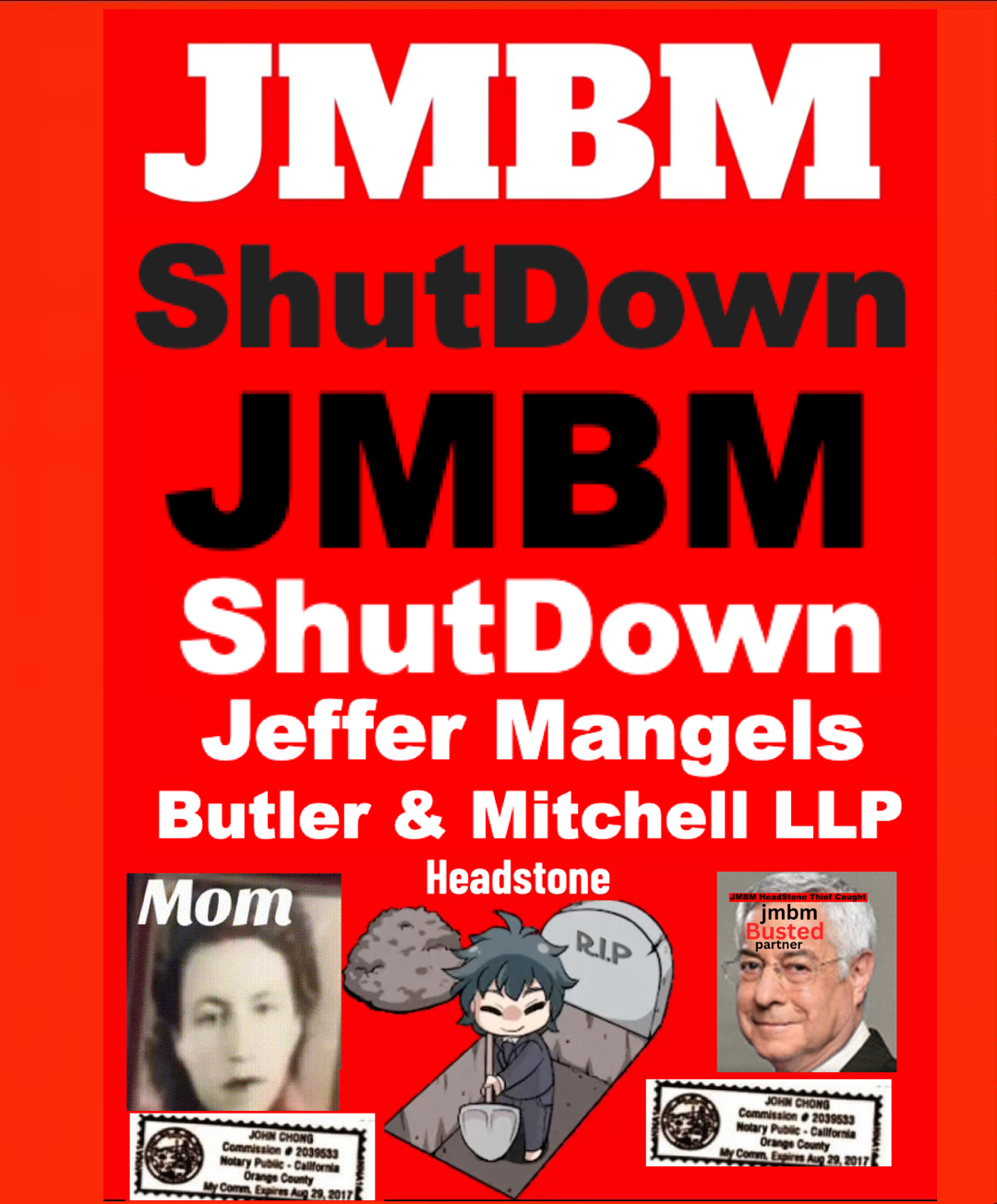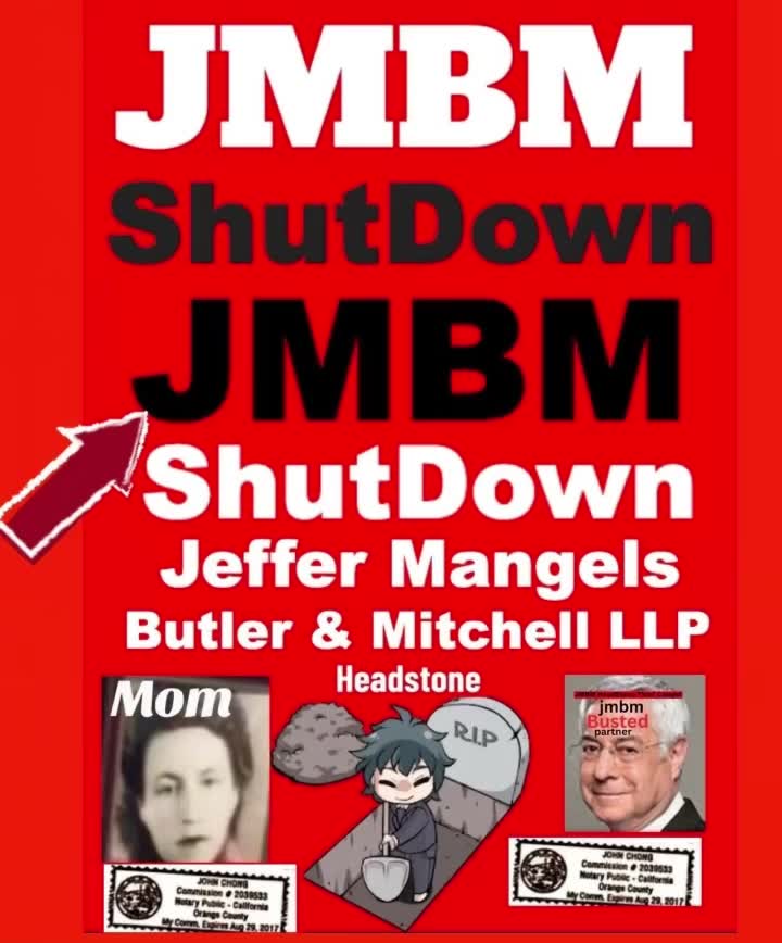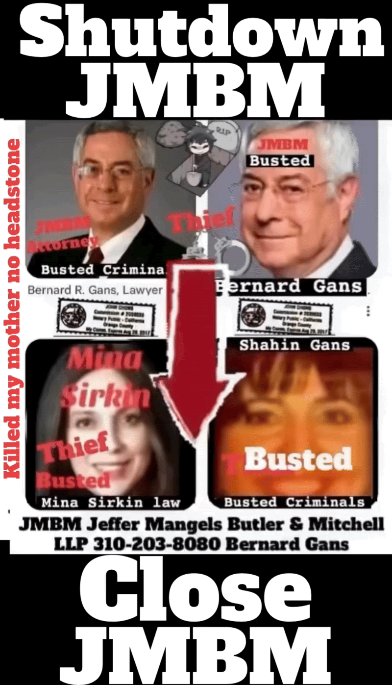 Suing JMBM partner $500,000,000,000.00 Busted criminal attorneys Jeffer Mangels Butler & Mitchell LLP lawyer Bernard Reginald Gans #57068 Bernard Gans Mina Sirkin law group JMBM killed my mom to get her fortune. Suing JMBM partner $500,000,000,000.00 Busted criminal attorneys Jeffer Mangels Butler & Mitchell LLP lawyer Bernard Reginald Gans #57068 Bernard Gans Mina Sirkin law group JMBM killed my mom to get her fortune.